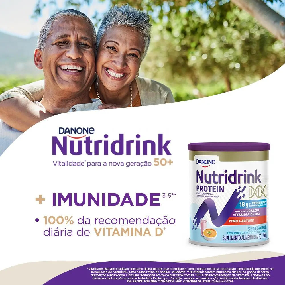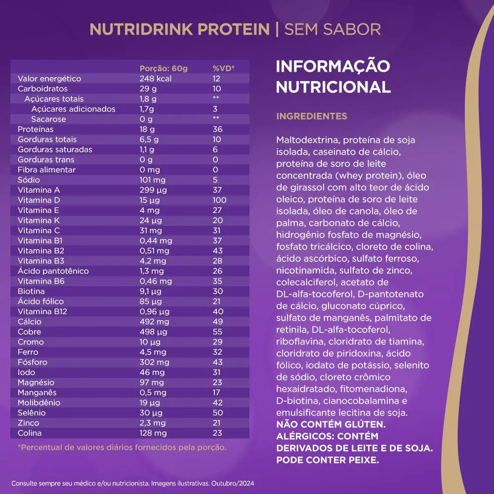 As proteínas constituem um dos componentes essenciais da dieta, sendo o seu consumo necessário ao longo de toda a vida, além de serem os principais componentes estruturais e funcionais de todas as células do corpo. Entre suas funções principais está a atuação na força muscular e no aporte de energia. A indicação de produtos deve ser sempre avaliada pelo profissional de saúde, caso a caso, conforme situação clínica e nutricional do paciente. Consulte sempre seu profissional de saúde. NÃO CONTÉM GLÚTEN. CONSULTE SEMPRE SEU MÉDICO E/OU NUTRICIONISTA. O que é e para que serve o Nutridrink Protein Pó O Nutridrink Protein Pó é um suplemento proteico completo e balanceado, que pode ser de consumo diário, conforme a recomendação do profissional de saúde. Contém alto teor de Proteínas, Vitamina D e Cálcio, que contribuem para a saúde muscular e óssea, além de Zinco e Vitamina C, que auxiliam na imunidade. Nutridrink Protein Pó pode ser ingerido por via oral ou sonda (enteral), conforme a recomendação do profissional de saúde. Não contém glúten, não contém lactose e a versão sem sabor também não contém sacarose (açúcar)